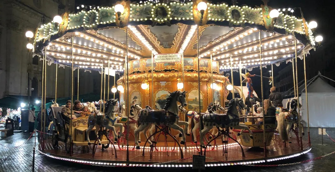 Iconic square transformed into a lively Christmas market and a winter wonderland of lights, carousels, and the irresistible aroma of Italian Christmas treats.