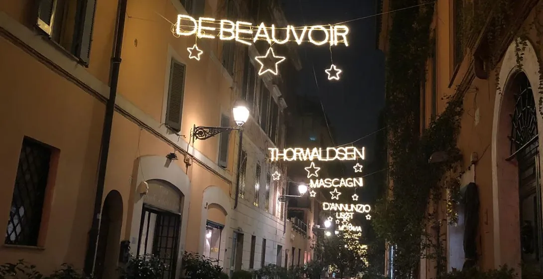 Rome’s beloved artists’ street, where twinkling garlands create a magical, serene holiday atmosphere.