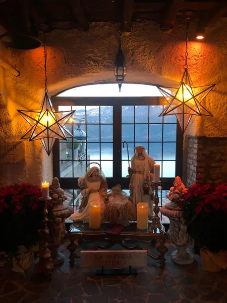 A charming square aglow with Christmas spirit, where the historic church delights visitors with a beautifully crafted Nativity scene.